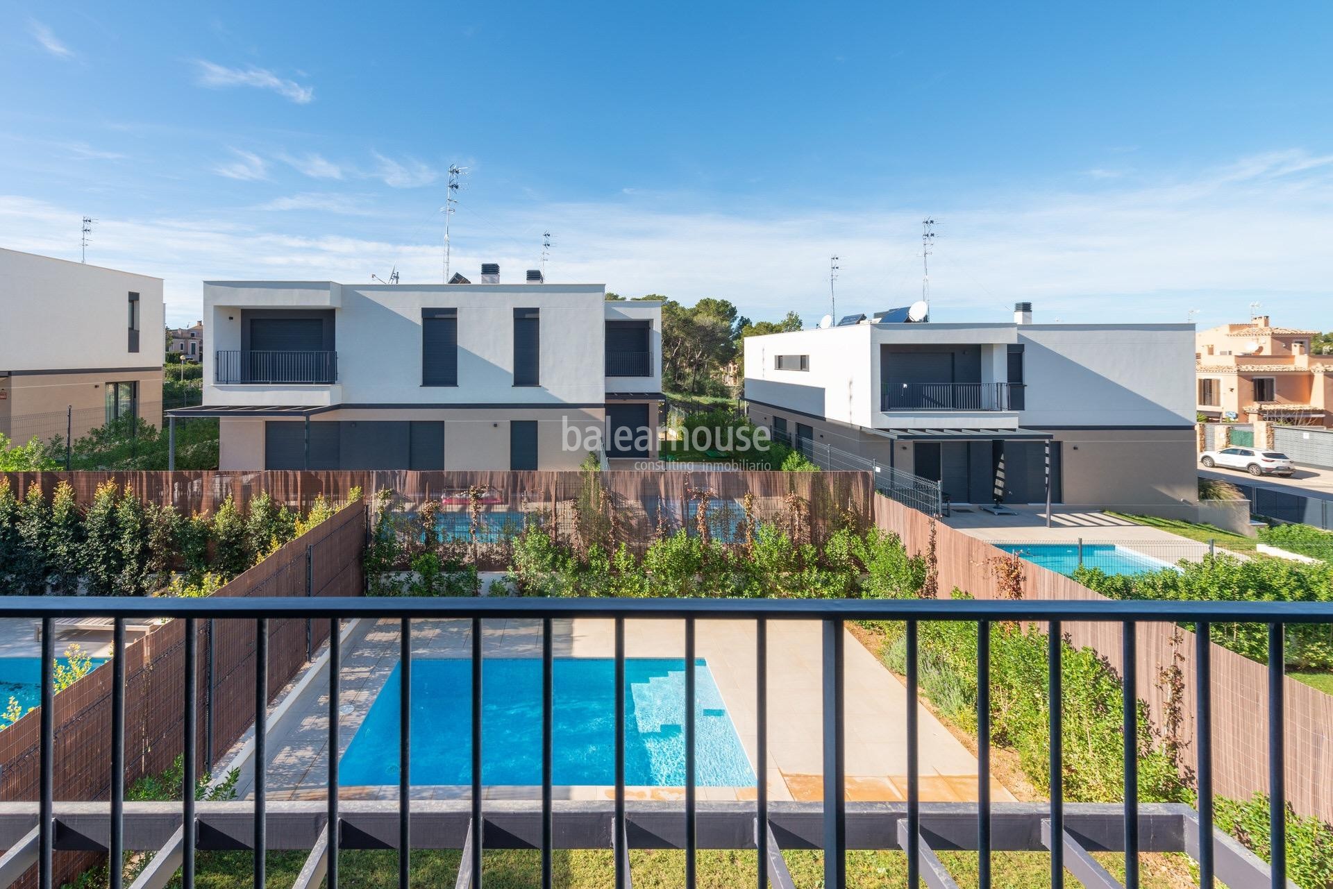 Modern new build houses in Puig de Ros with large terrace areas, garden and swimming pool.