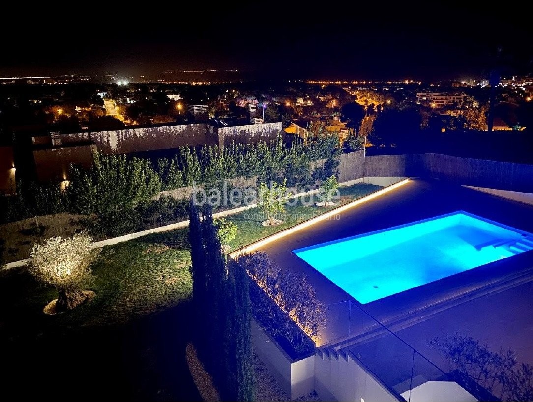 Designed by a prestigious architect and completed in 2021, the villa enjoys fantastic panoramic views to the sea and the Tramuntana mountains. The property leaves nothing to be desired in terms of quality, comfort and design. On a generous plot of 1038 m2, this luxury villa has a constructed area of approximately 521 m2 distributed over three floors connected by stairs and a Thyssen/Krupp lift, as well as a very generous roof terrace.