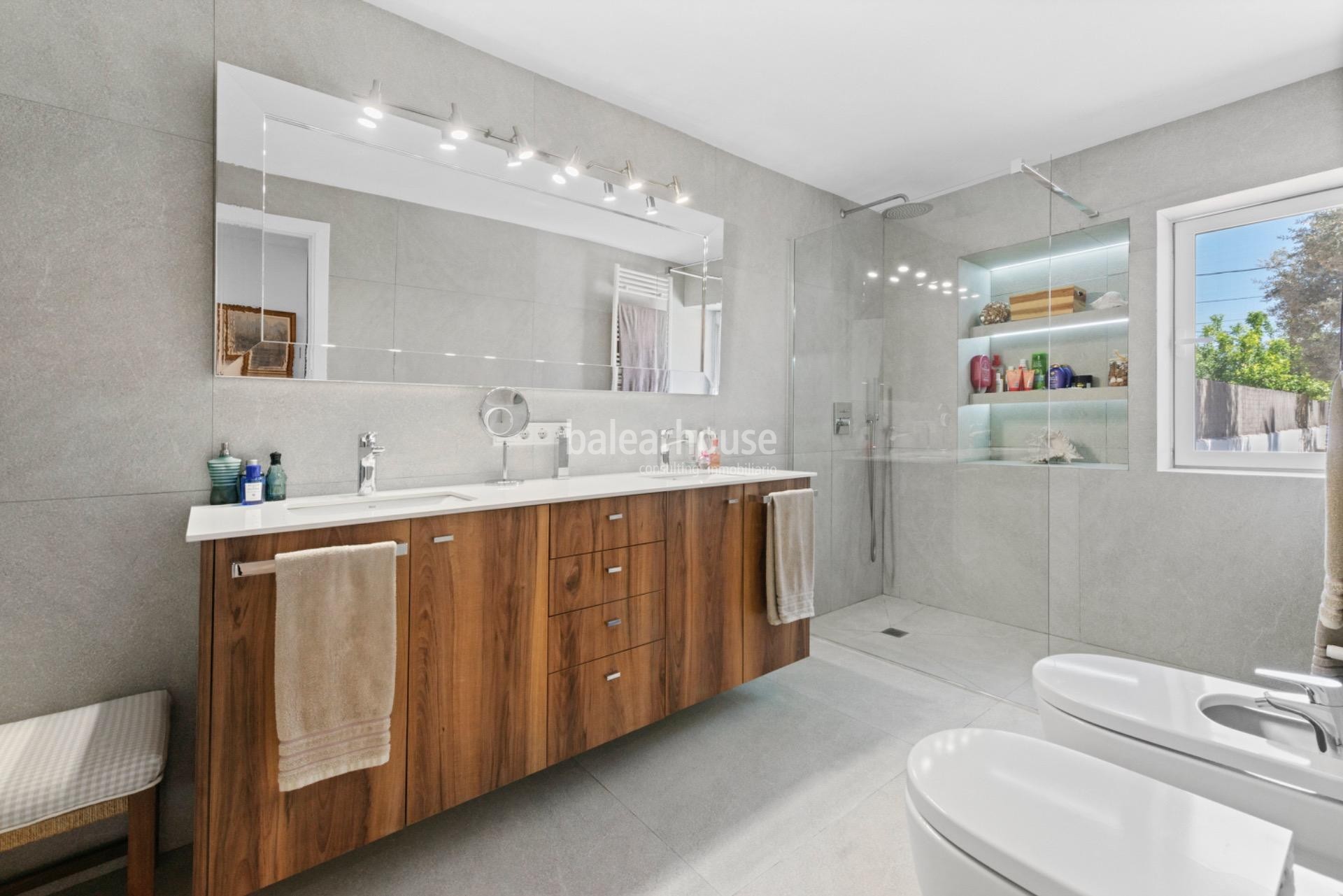 Cuenta con cuatro amplios dormitorios provistos de armarios empotrados y cinco baños de estética actual y muy funcionales. El dormitorio principal cuenta con gran baño en suite equipado con ducha y bañera independientes y una amplia sala de vestidor para tenerlo todo organizado. El espacio principal está ocupado por el elegante salón-comedor con chimenea y cocina abierta que se integra perfectamente en el ambiente y dispone de gran capacidad de almacenaje. Todo este espacio amplio y luminoso está lleno de detalles actuales que le dan un plus de estilo y confort y desde donde acceder directamente a las fantásticas zonas exteriores.